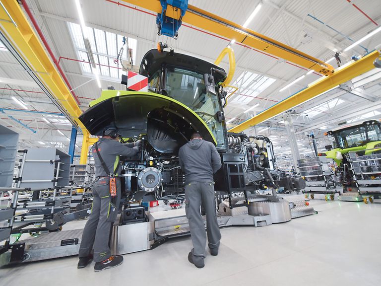 Die fertig lackierten Kraftstränge, bei denen auch das Hubwerk schon montiert ist, wandern mit einem Transportsystem in Richtung Hauptmontagelinie. Dort wird jeder von ihnen bereits von seinem eigenen „Taxi“ erwartet: einem Automated Guided Vehicle (AGV).