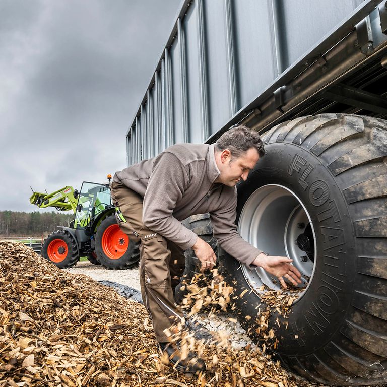 Für den Hackschnitzeltransport kommt ein ARION 440 in Kombination mit einem 40 m³ Abschiebewagen zum Einsatz. Pro Jahr fährt Matthias Distler mit seinen Mitarbeitern ca. 20.000 t Hackschnitzel mit diesem Gespann ab. Dabei profitiert er von: