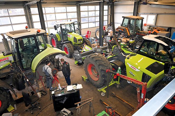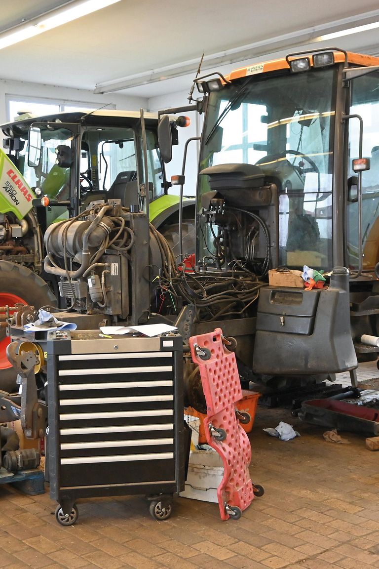 Wie aus einem Suchbild zur Landtechnik: Jeder Quadratzentimeter Werkstatt ist ausgenutzt, alle Mitarbeiter am Standort Homberg ständig im Einsatz bei Reparatur, Wartung und Service für die CLAAS und Renault-Kunden.